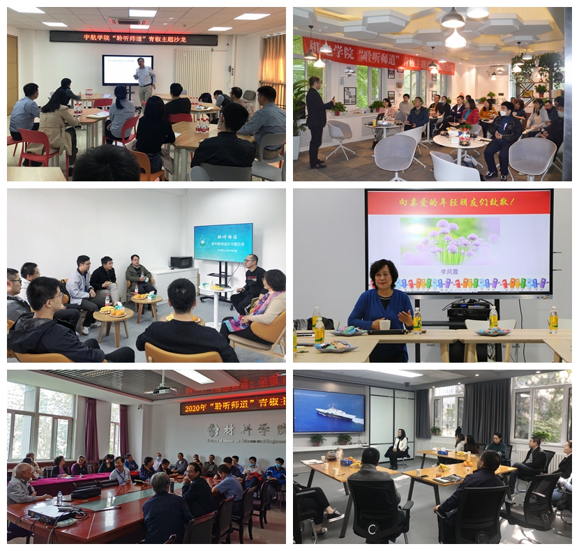 宇航学院邀请林海教授、贺媛媛副教授分享教育教学经验,并就教学改革与成果申报等方面与青年教师进行了交流讨论;机电学院邀请优秀青年教师代表黄广炎教授,以“浅谈青年教师的‘四个心’”为题,向青年教师分享了个人成长历程;光电学院邀请曹峰梅副教授,以“融入团队,终身学习,成就事业”为题分享了工作经验;计算机学院邀请北京市教学名师李凤霞教授,以“用科研的方法做教学”为题分享教书育人方法探索;化学与化工学院邀请彭熙伟、李晖、张小玲、赵之平、李全松等多位教师代表,结合课程思政、教学方法、科研创新、社会服务等方面,分享为师执教经验;管理与经济学院邀请何海燕教授,以“凝心聚力、创新发展:寄语青年”为题分享个人工作感悟;法学院结合国家社科基金申报工作,邀请教师代表分享了项目选题、研究内容、创新点等方面的经验方法,通过线上线下相结合的方式,让青年教师受益……